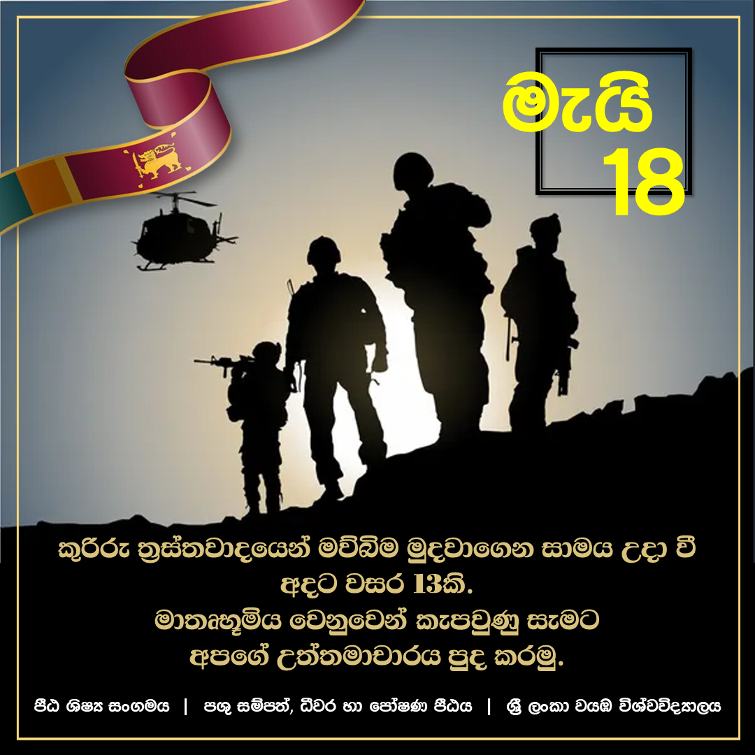 යුද්ධයේ දී මිය ගිය , ආබාධිත වූ සියලුම මනුශ්යන් ද රට වෙනුන්වෙ දිවි පිදූ සියලුම රණවිරුවන්වද ගෞරව සම්ප්රයුක්ත්ව සිහි කරන්නෙමු.