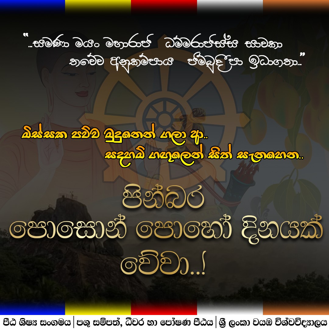 Read Moreසකල ශ්රී ලාංකිකයන් මෝහාන්ධකාරයෙන් මුදාලනු වස් අනුබුදු මිහිඳු මහ රහතන් වහන්සේ උතුම් බුදුදහම රැගෙන මිස්සක පවුව මතින් වැඩම කළා වූ පොසොන් පුර පසළොස්වක පොහෝ දිනය අදයි. පොසොන් සඳ කිරණෙන් ලක්දීපයම නැහැවෙනා සියලු සතන් ධර්මාලෝකෙන් ආලෝකමත් වන්නා වූ පින්බර පොසොන් දිනයක් වේවා !! පීඨ ශිෂ්ය සංගමය, පශු සම්පත්, ධීවර හා පෝෂණ පීඨය, ශ්රී ලංකා වයඹ විශ්වවිද්යාලය